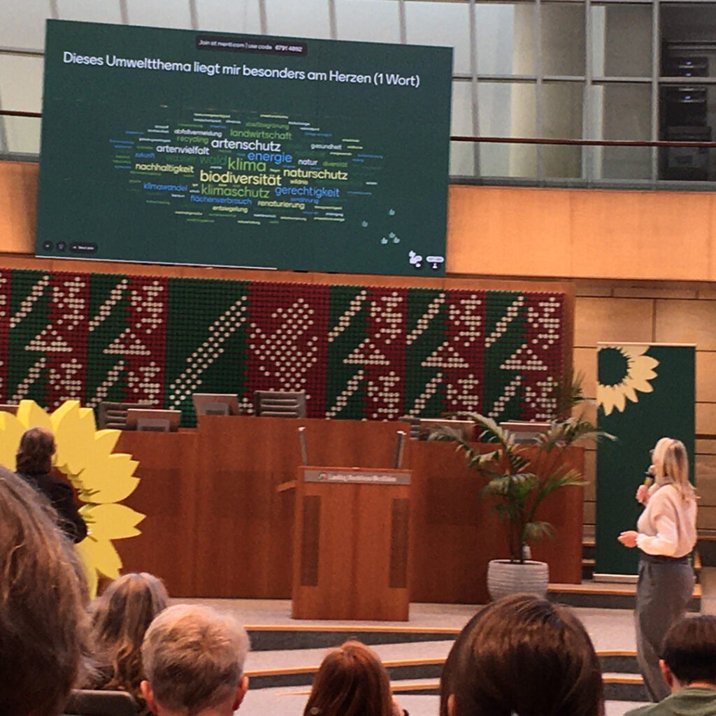 Zur Einstimmung kam ein Mentimeter zum Einsatz – ein interaktives Tool, mit dem das Publikum per Smartphone Fragen live beantworten konnte, z.B. „Welches Umweltthema liegt dir besonders am Herzen?“ Das Ergebnis erschien in Echtzeit als Wortwolke auf einer großen Leinwand. Eine lockere Art, gemeinsam ins Thema einzusteigen und ein Gefühl dafür zu bekommen, welche Umweltthemen den Teilnehmenden besonders wichtig sind.