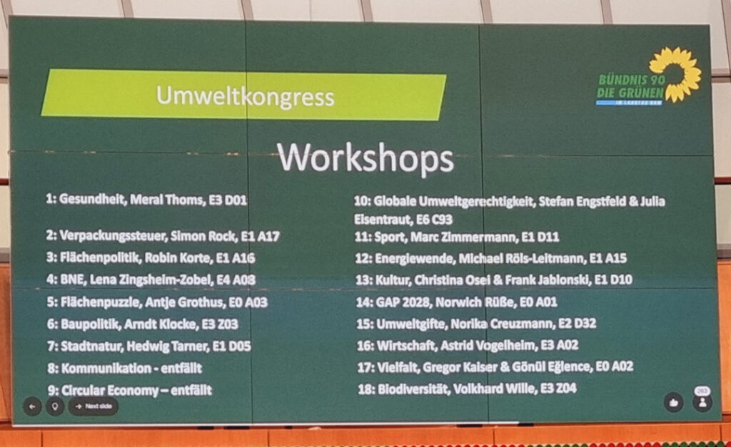 Der Kongress selbst bot ein vollgepacktes Programm: Nach der Begrüßung durch Verena Schäffer und Dr. Volkhard Wille folgte eine inspirierende Keynote von Ewald Lienen. Danach ging es direkt in die Themen-Workshops – und die Auswahl fiel schwer! Sabine entschied sich für „Natur in der Stadt: Nachhaltigkeit konkret gestalten“, Sigrid für „Energiewende trifft Artenvielfalt“. Beide Workshops hätten gut doppelt so lang sein dürfen, so spannend waren Diskussionen und Input.