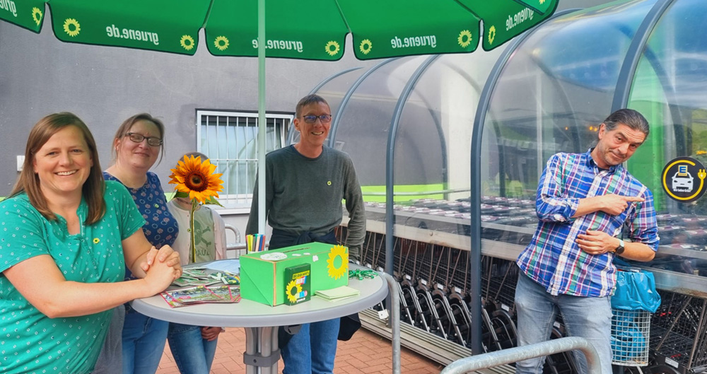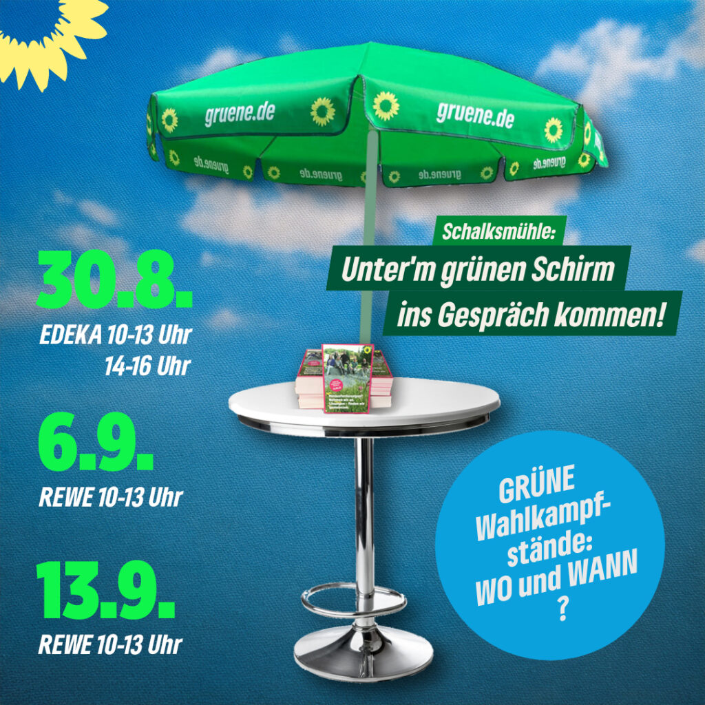 30. August 2025 | Heute waren wir mit unserem ersten grünen Wahlstand vor dem EDEKA in Schalksmühle. Wir haben uns sehr über die positive Resonanz gefreut – von jungen Leuten, Familien bis hin zu älteren Schalksmühlern. Viele haben Infomaterial oder ein kleines Goody mitgenommen. Besonders beliebt waren unsere bunte Knete und natürlich die Gummibärchen!